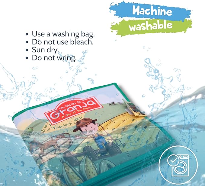 - BILINGUAL TEXTS - This is not a regular quiet book, actually, this one tells a story written in English and in Spanish, ideal for your children to learn or practice a second language. Un día en la granja is perfect for Spanish learning for babies. Made with soft fabric pages provide a fun texture and make learning to read fun for baby. Es el libro perfecto para que tu bebé aprenda Español como segunda lengua.