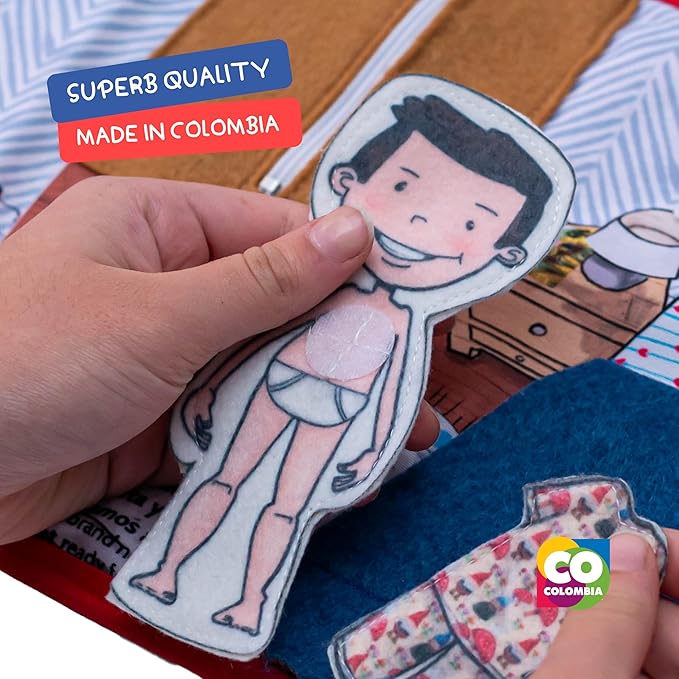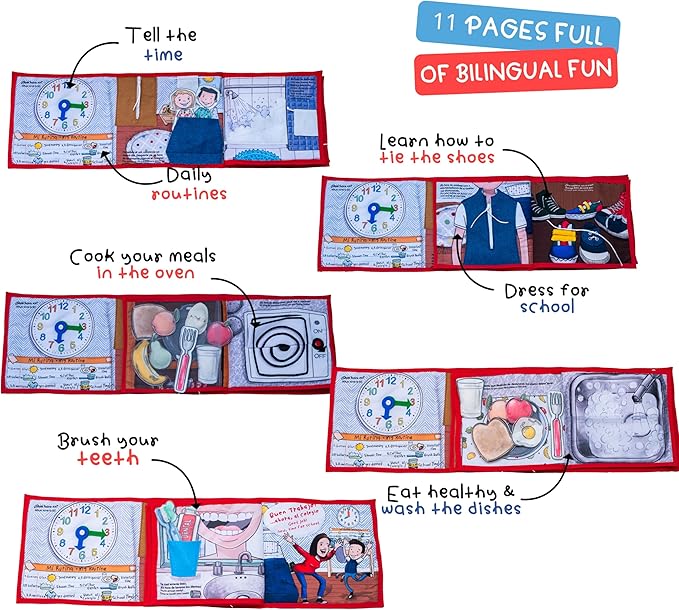 Routines 11 Pages Quiet Book for 3+ Year Old Boys and Girls | Bilingual Soft Book | Preschool and Early Learning | Montessori Fabric Book for Toddlers | Play and Learn Toy | 14 Pieces Included.
