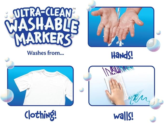 - WASHABLE MARKERS: Crayola Ultra-Clean Markers wash easily from skin, painted walls, and most clothing.