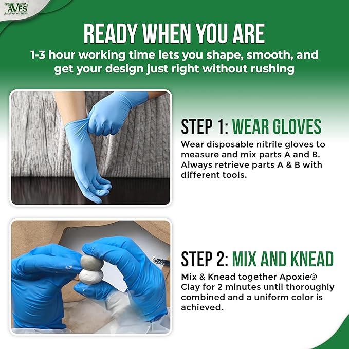- 𝐄𝐚𝐬𝐲 𝐏𝐫𝐞𝐩𝐚𝐫𝐚𝐭𝐢𝐨𝐧: Measure and mix equal parts of A & B with disposable nitrile gloves. Mix and knead for 2 minutes until it is a uniform color and begin your project. Smooth or texture with a wet finger, brush, cotton swab, or sculpting tool. With up to 3 hours working time, you will have plenty of time to create.