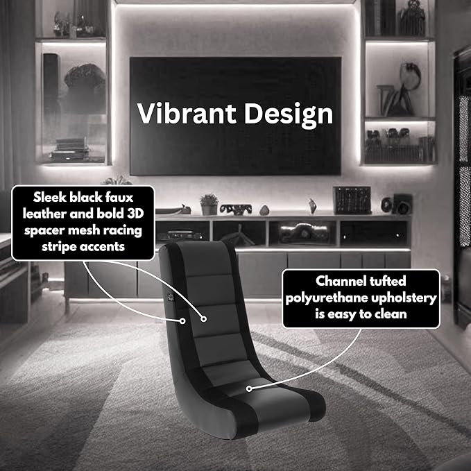 The Crew Furniture Classic Video Rocker Floor Gaming Chair, Kids and Teens, Racing Stripe PU Faux Leather & Polyester Mesh, Black/Black