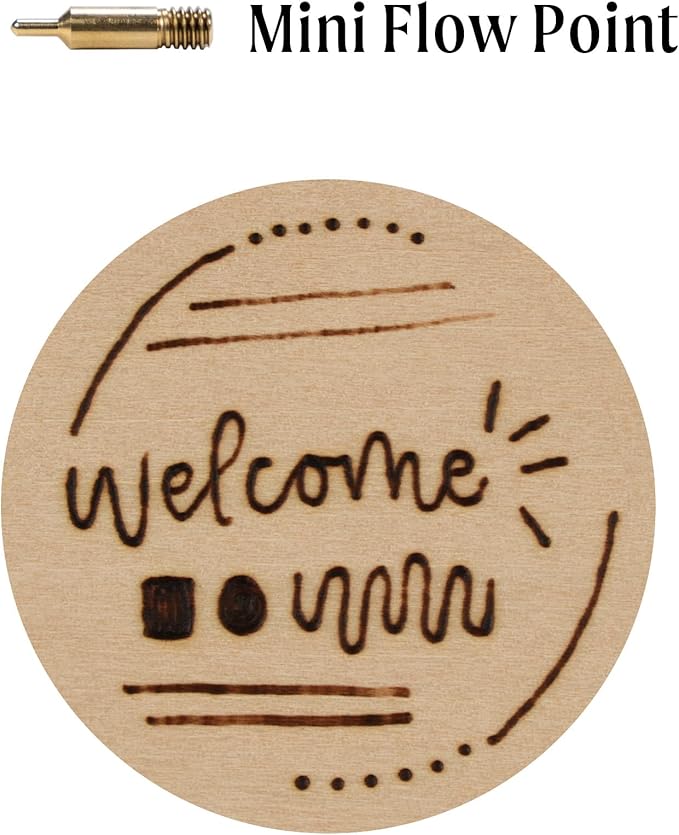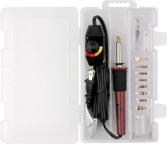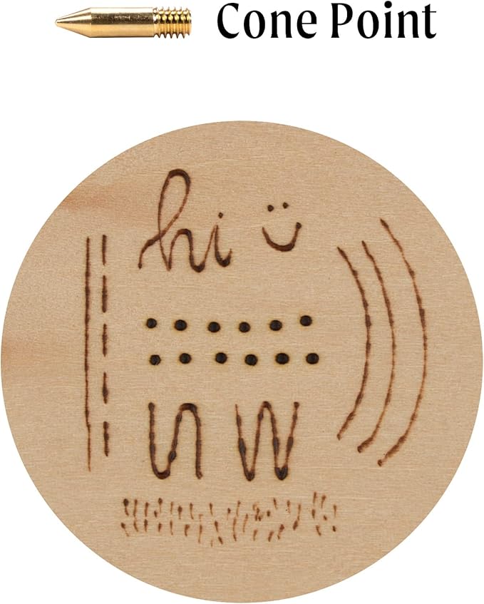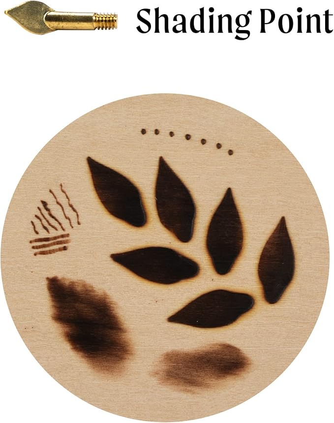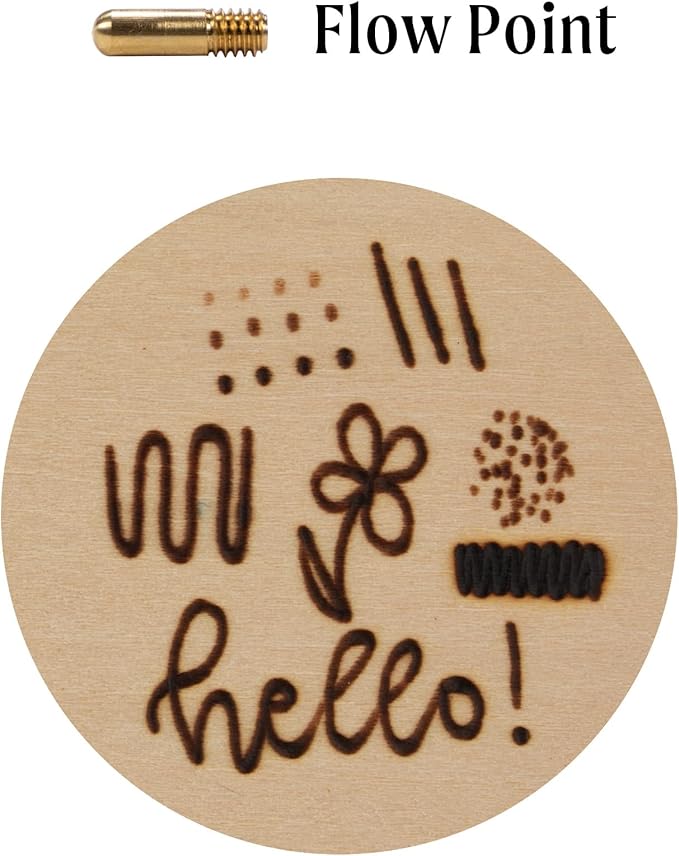 - Wood burning tool with variable temperature control and 11 points: Cone Point; Shading Point; Universal Point; Mini Universal Point; Tapered Point; Calligraphy Point; Hot Knife Point; Soldering Point; Stamping Point; Flow Point; and Mini Flow Point