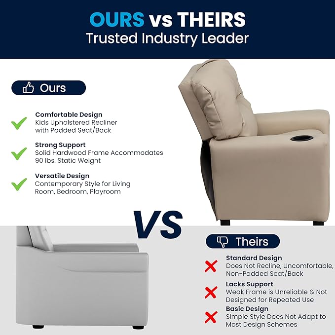 Flash Furniture Chandler Vinyl Kids Recliner with Cup Holder and Safety Recline, Contemporary Reclining Chair for Kids, Supports up to 90 lbs., Beige