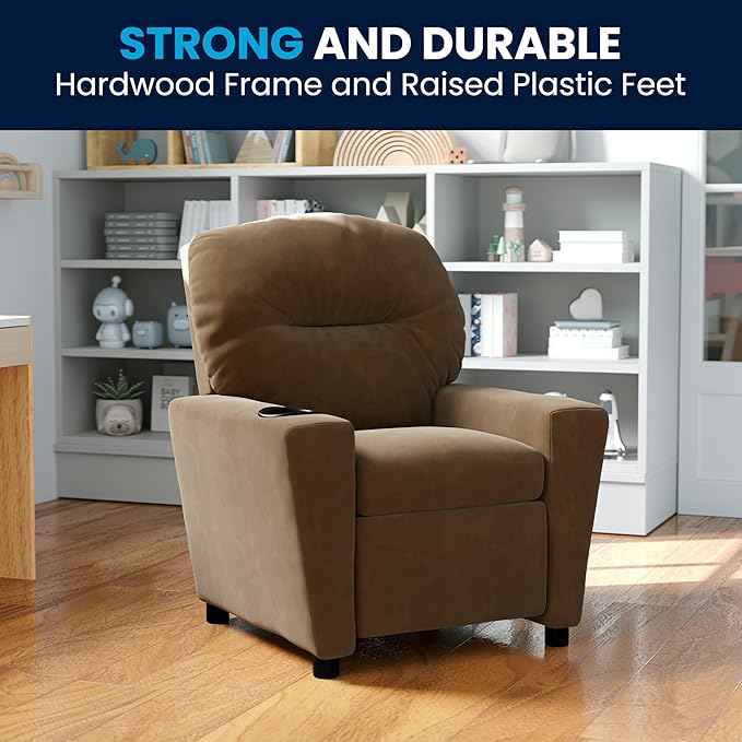 Flash Furniture Chandler Microfiber Kids Recliner with Cup Holder and Safety Recline, Contemporary Reclining Chair for Kids, Supports up to 90 lbs., Brown
