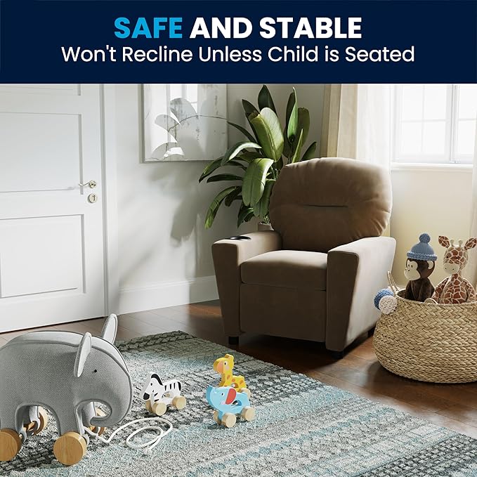 - KID-FRIENDLY AND COMFY: Plush padded back provides superior comfort for your little ones, and the safety feature will not allow the chair to recline unless your child is in seated position and pulls ottoman 1" out and then reclines