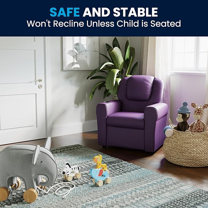 Flash Furniture Vana Vinyl Kids Recliner with Cup Holder, Headrest, and Safety Recline, Contemporary Reclining Chair for Kids, Supports up to 90 lbs., Purple