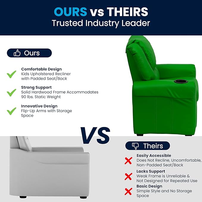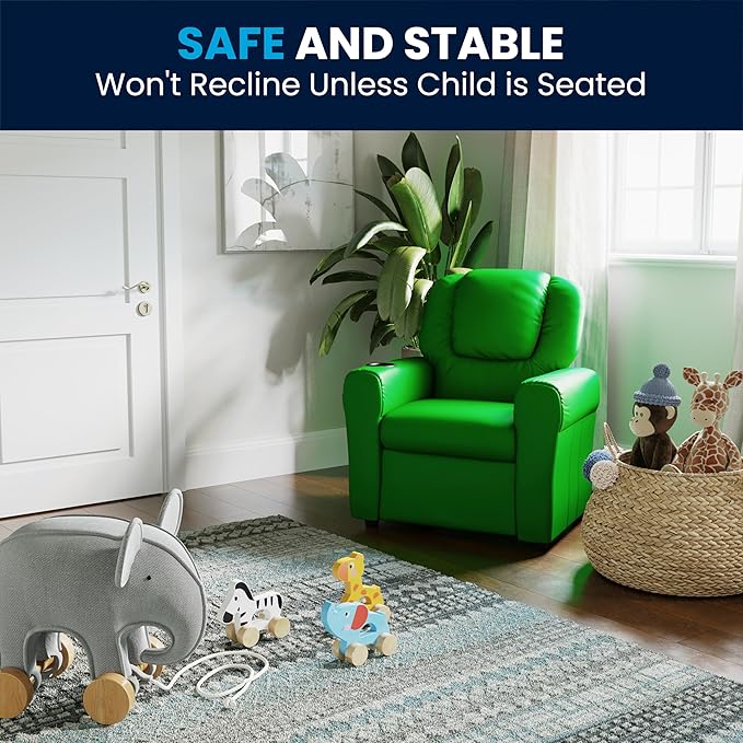 Flash Furniture Vana Vinyl Kids Recliner with Cup Holder, Headrest, and Safety Recline, Contemporary Reclining Chair for Kids, Supports up to 90 lbs., Green
