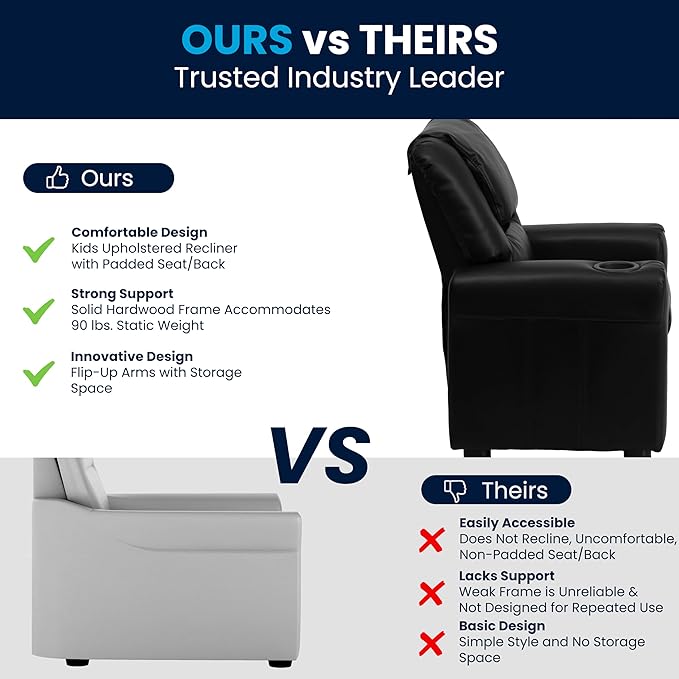 - KID-FRIENDLY AND COMFY: Plush padded back and seat provides superior comfort for your little ones, and the safety feature will not allow the chair to recline unless your child is in seated position and pulls ottoman 1" out and then reclines