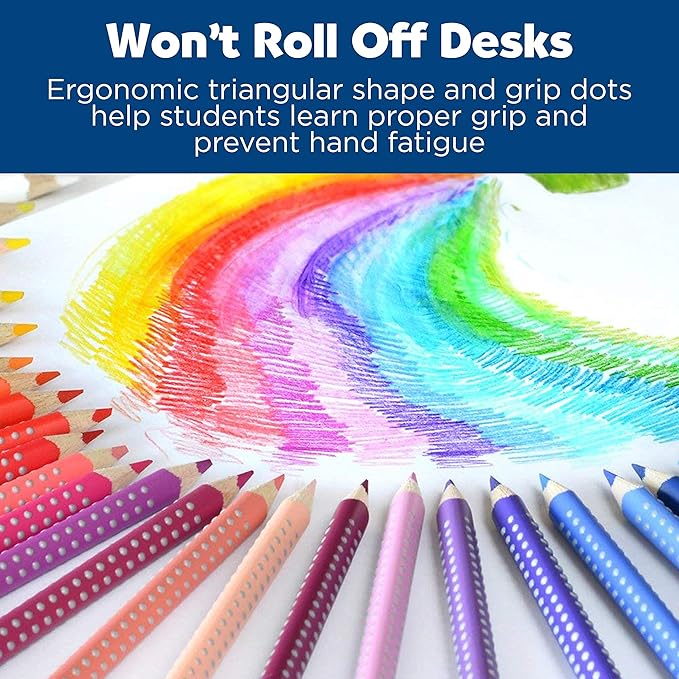 - ERGONOMIC COLOR PENCIL: Grip Watercolor Pencils feature an extra-thick, triangular shape and textured grip dots for comfort and control. Designed to support a proper grip and reduce hand fatigue, Faber-Castell watercolor pencils are ideal for kids art supplies. The unique shape prevents rolling off desks, making them a must-have colored pencil set for kids