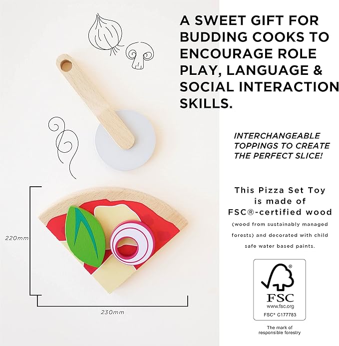 - KITCHEN & FOOD TOYS: This pizza wooden food toys set are the perfect toddler toys. Play together with this wooden toy pizza accessories and kitchen set accessories. With this fun wooden food for kids, your child will have fun whilst learning social skills