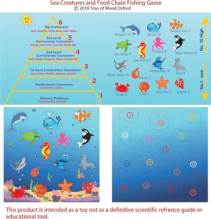 - This fishing game can be played as randomly fishing like a normal fishing puzzle, number jigsaw puzzle or magnetic puzzle. It is more fun and educational to play the food chain fishing game. The bigger the number on the back of the sea creature the more powerful it is in the food chain. The picture of the fishing board inside the frame indicates roughly the vertical depth of the sea and the distribution level of these creatures in the sea.