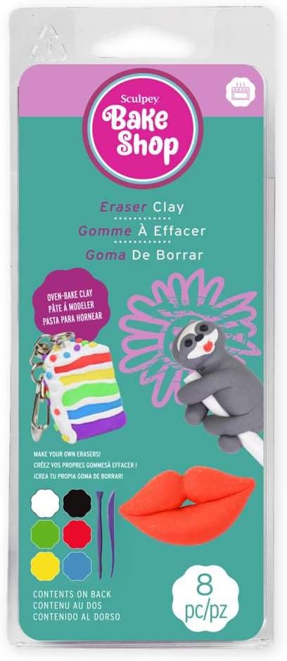 Sculpey Bake Shop Eraser Polymer Oven Bake Clay, 6 unique color set, becomes real erasers after baking, 1 modeling tool, Great for creating holiday, DIY projects, jewelry and school projects.