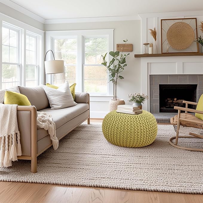 COTTON CRAFT - Hand Knitted Cable Style Dori Pouf - Green - Floor Ottoman - Cotton Braid Cord - Handmade & Hand Stitched - Truly one of a Kind Seating - 20 Dia x 14 High
