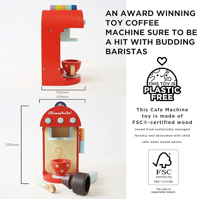 • EXTEND PLAY TIME WITH THE HONEYBAKE COLLECTION: This charming Cafe Machine Pretend Play Toy makes makes an excellent accompaniment to other wooden toys within Le Toy Van's Honeybake range - Including the Wooden Mixer, Pink Oven & Hob Set, Pots And Pans and the pretend play Farmhouse Wooden Kitchen.