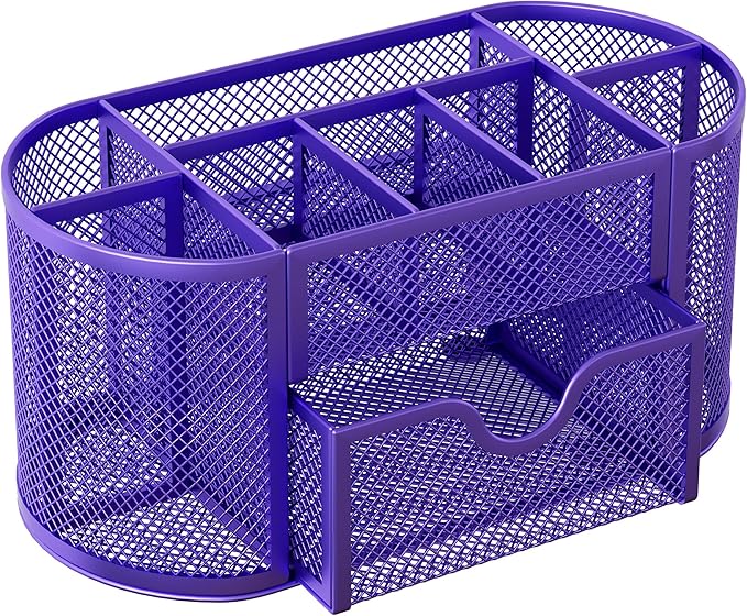 EasyPAG Mesh Pen Holder Desk Organizer with Drawer Stationery Supplies Organizer for Dorm School 9 Compartments Workspace Desk Accessories Organization for Office, Purple