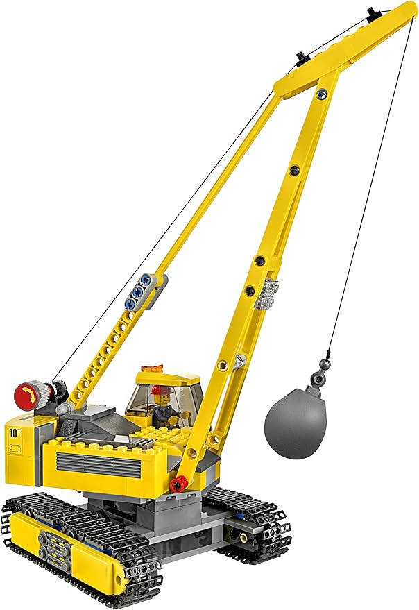 - Features a crane with movable jib and wrecking ball, front-end loader with moving bucket, dump truck with tipping bed