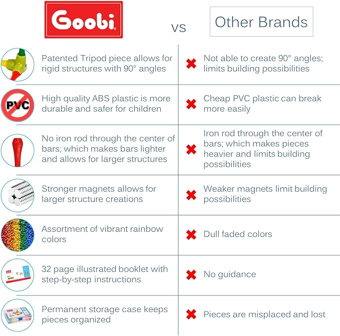 - EDUCATIONAL & SUPERIOR QUALITY: We specialize in creating educational toys that encourage creativity, fine motor skills, interaction, playful experimentation, and which also serve as a valuable kit for a STEM learning curriculum. Goobi products are made using the best material on the market such as ABS plastic. The bars (rods) and balls form incredibly strong connections making it possible to build large scale structures that are sure to fascinate the whole family.