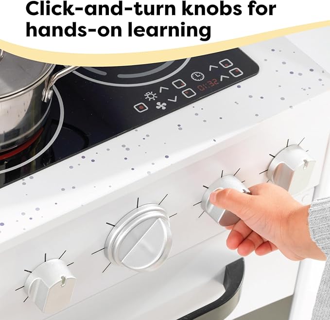 - HANDS-ON PLAY: There's tons to do in this play kitchen. Kids can turn the clickable knobs, pretend push buttons on the microwave, open doors or talk on the cordless play phone.