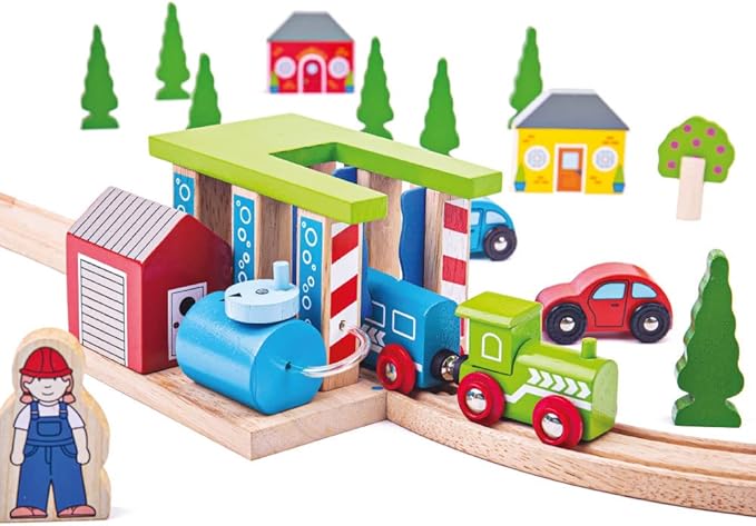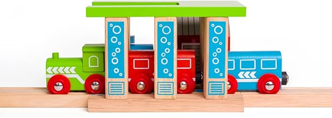 - EDUCATIONAL TOYS - This wooden train set accessory encourages dexterity, hand-eye coordination and fine motor skills as children run their toy trains through the washer to get it clean.