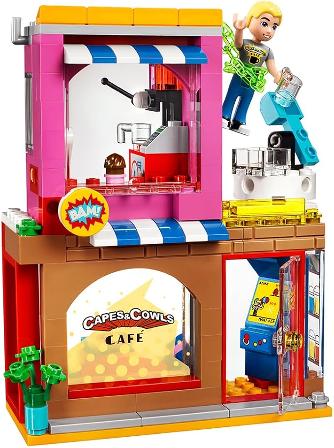 - Build the Harley Quinn’s jet with movable wings, and the two-level café featuring a cupcake catapult and rotating arcade machine!