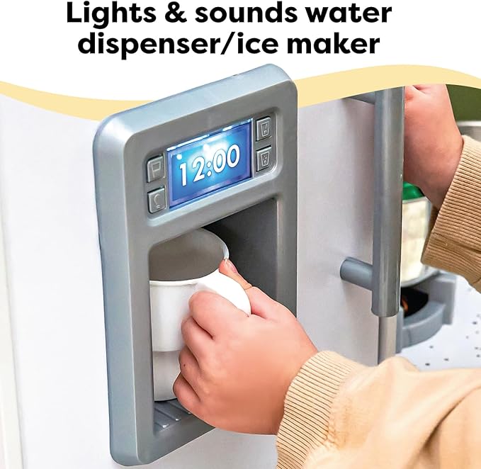 • LIGHTS and SOUNDS: The burners light up and make cooking sounds; water dispenser also lights up and makes realistic sounds when pressed.