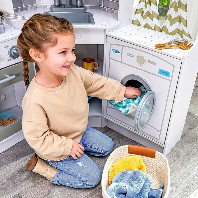 • SO DETAILED: Kids will find plenty of hands-on learning with buttons to press, knobs to turn and handles to pull. And, with homey touches like fabric curtains, a wall phone and lots of storage, this wooden kitchen is almost just like the real thing.