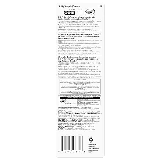 GUM Crayola Marker Children’s Toothbrush, Soft Bristled Kids’ Toothbrush Set Age 3+, Suction Cup Base, 3 Count