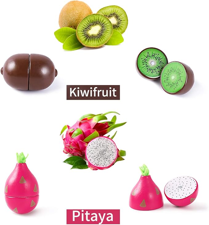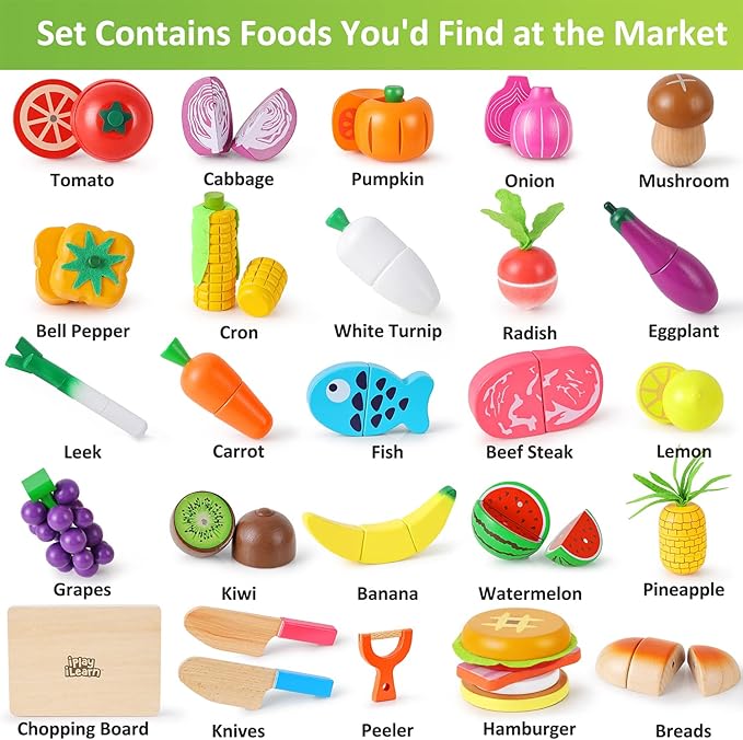 - WOOD MADE – SAFER THAN PLASTIC MADE SETS. A creative pretend food cutting party! Fun toy for toddler girls and boys. Small pieces suitable for ages 3 and up. Rest assured our set includes fun and organic varieties of healthy food. Pieces contain magnets inside holding like pieces together that can be separated using the included wooden knife.