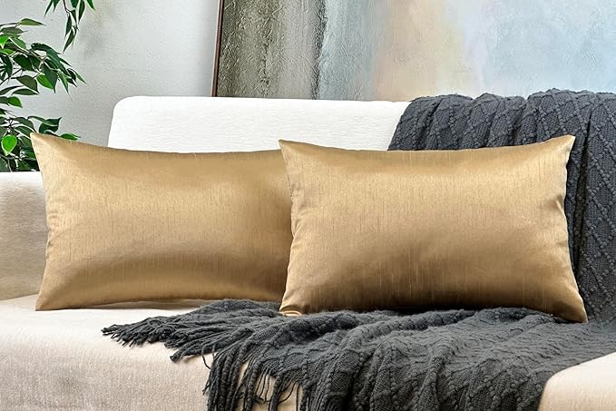 Aiking Home 12x18 Inches Faux Silk Rectangular Throw Pillow Cover, Zipper Closure, Brass (Set of 2)