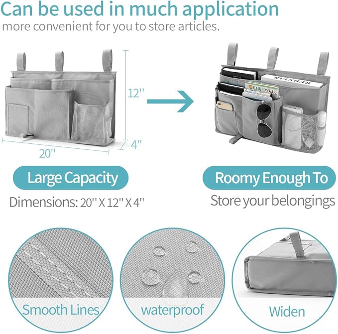 - PERFECT DEMENSIONS - The size of this bedside storage caddy bag is 20L * 12W * 4H inches, works great on headboard or any bed rail. Perfect for top bunk bed, college dorm room, hospital bed, baby crib, wheelchair, chair, regular bed with rails, camp or traveling. Use as a bunk bed caddy, bed storage pocket, bunk organizer for camp, bedside caddy for dorms, footboard bedside organizer caddy, college dorm room accessories, hospital bed organizer.