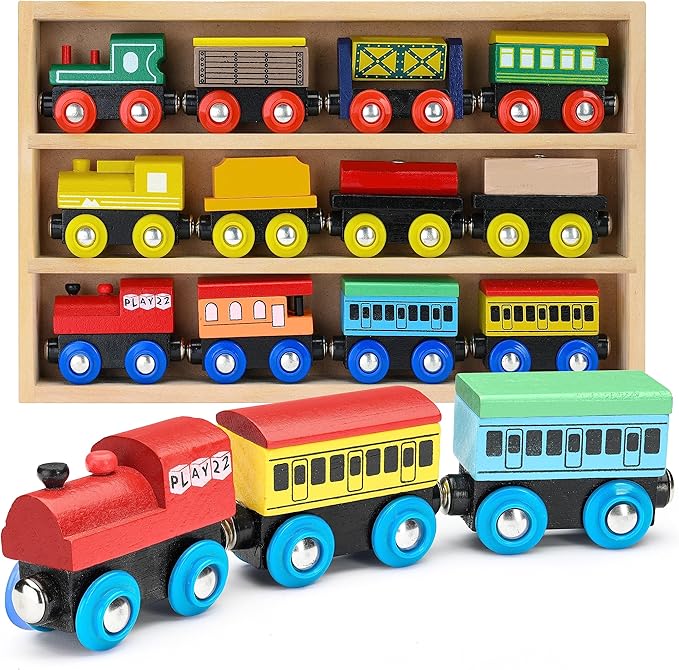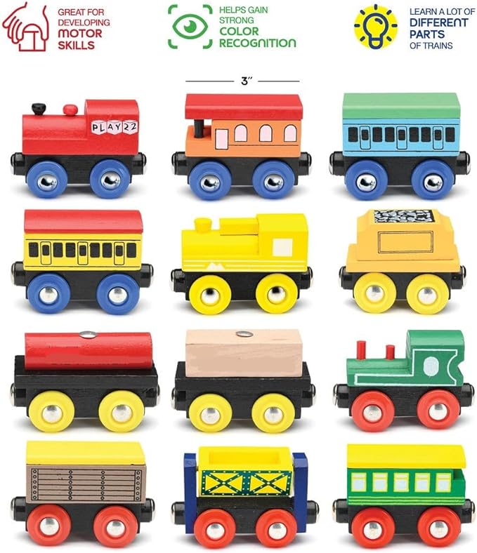 Wooden Train Set 12 PCS - Train Toys Magnetic Set Includes 3 Engines - Toy Train Sets For Kids Toddler Boys And Girls - Compatible With All Major Brands - Original - By Play22