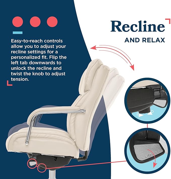La-Z-Boy Sutherland Quilted Leather Executive Office Chair with Padded Arms, High Back Ergonomic Desk Chair with Lumbar Support, Ivory White Bonded Leather