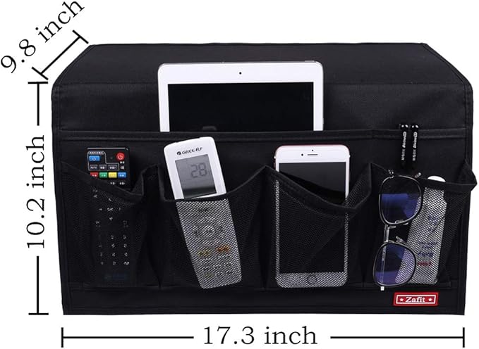 - Application on bedside, sofa, desk, chair, mattress, table,etc. Neatly stores your remote TV control, flashlights, medications, cellphone, TV guide, A4 magazines, notebooks, pens, glasses, snacks, and earphones.