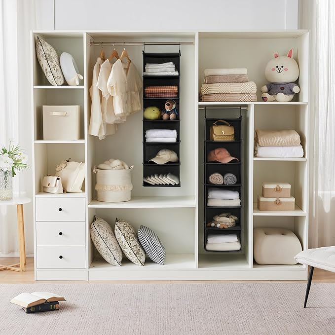 - HANGING CLOSET ORGANIZER - Improve your closet organization with open shelving that provides great accessibility and visibility, organizer maximizes utilization of vertical space, makes it perfect for small closets.
