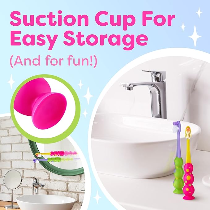 - A SUCTION CUP UNDERNEATH - It allows you to attach the children’s toothbrush to the sink, a mirror, or a shelf for it to always be at hand and never get lost for when the kid finally feels like going to brush their teeth—or, actually, is told to do so by the parents!