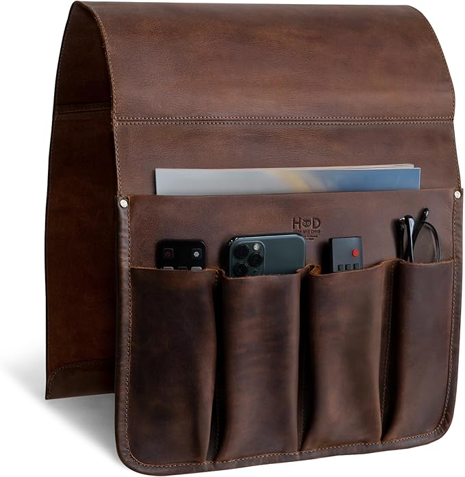 Hide & Drink, Magazine Holder for Sofa Armrest, Organizer Pouch, Armchair Caddy, Full Grain Leather, Handmade (Bourbon Brown)