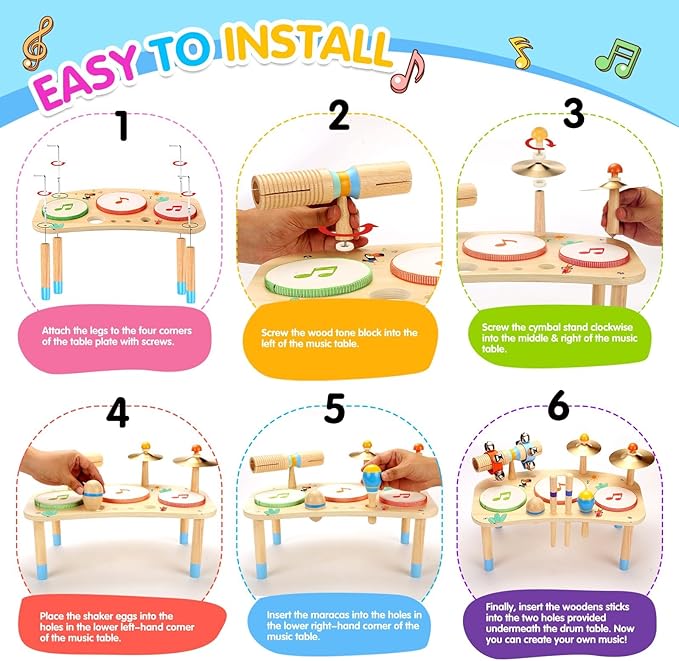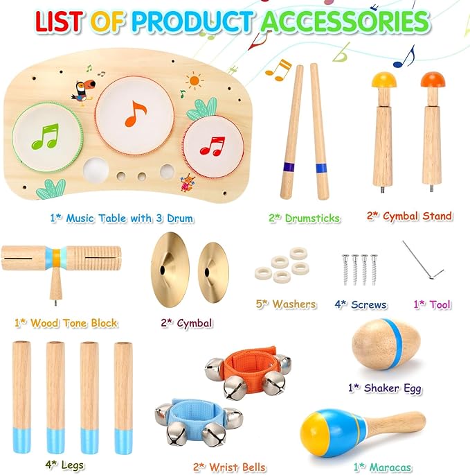 - All in 1 Kids Drum Set: Our kids drum set comes with 1 x Music Table with 3 Drum, 1 x Maracas, 1 x Wood Tone Block, 1 x Shaker Egg, 2 x Cymbal, 2 x Wrist Bells, 2 x Cymbal Stand, 2 x Drumsticks, 4 x Legs, 4 x Screws, 5 x Washers, 1 x Tools