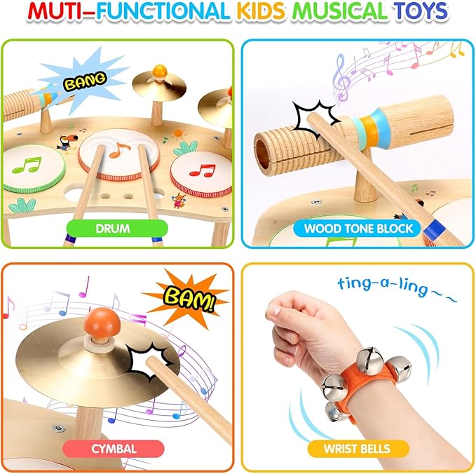 - All in 1 Kids Drum Set: Our kids drum set comes with 1 x Music Table with 3 Drum, 1 x Maracas, 1 x Wood Tone Block, 1 x Shaker Egg, 2 x Cymbal, 2 x Wrist Bells, 2 x Cymbal Stand, 2 x Drumsticks, 4 x Legs, 4 x Screws, 5 x Washers, 1 x Tools