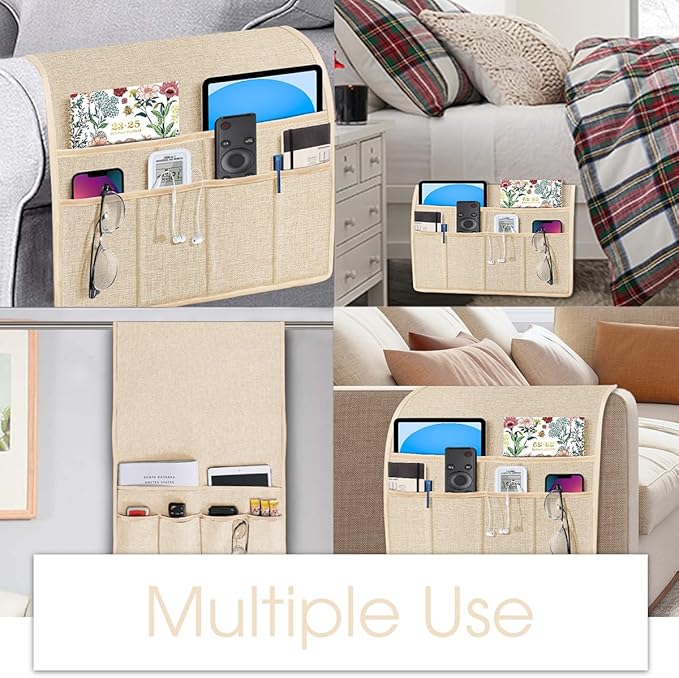 - 【Handy Pockets】6 pockets of the armrest organizer are designed for your necessities. You can put newspaper, magazines, iPad and tablet into the two largest pockets, remote controls, eye-glasses, mobile phones and other portable devices into the four standard pockets, keep them handy whenever you need them