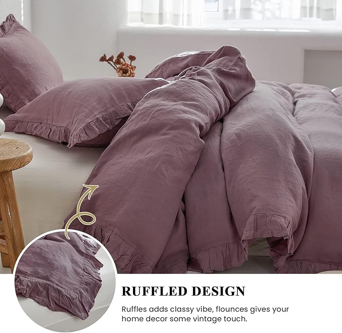 Simple&Opulence 100% Linen Duvet Cover Set, 3 PCS Natural French Flax Purple Ruffle Duvet Cover King Size, Breathable Comfy Linen Bedding Comforter Cover with 2 Pillowcases (Purple, 104" X 92")