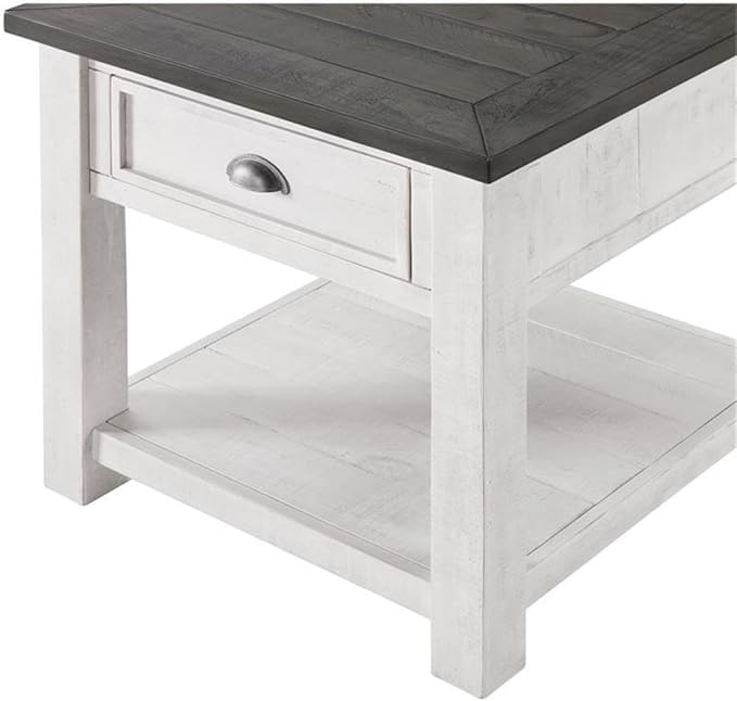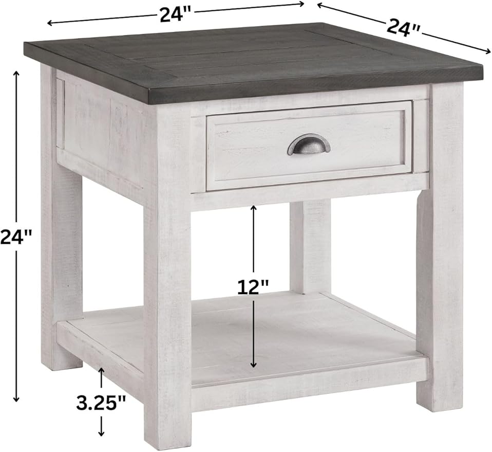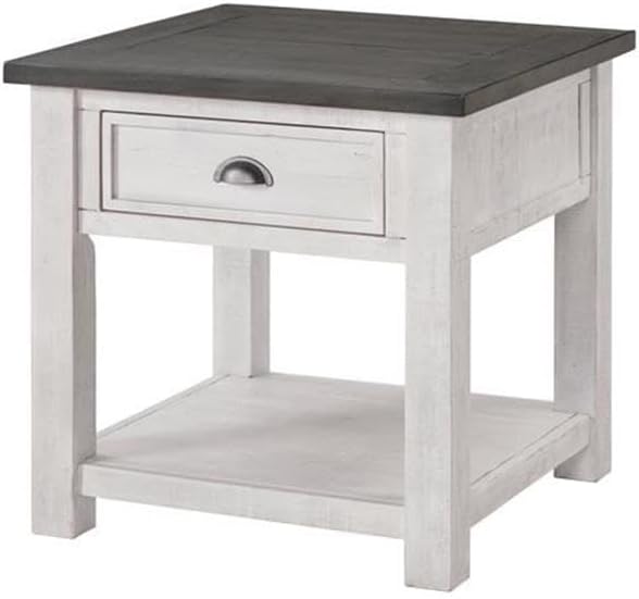 - TIMELESS COASTAL FARMHOUSE CHARM – Enhance your living room with this solid pine wood end table finished with a white stain base and grey top and featuring framed drawer fronts and antique pewter hardware for effortless style.