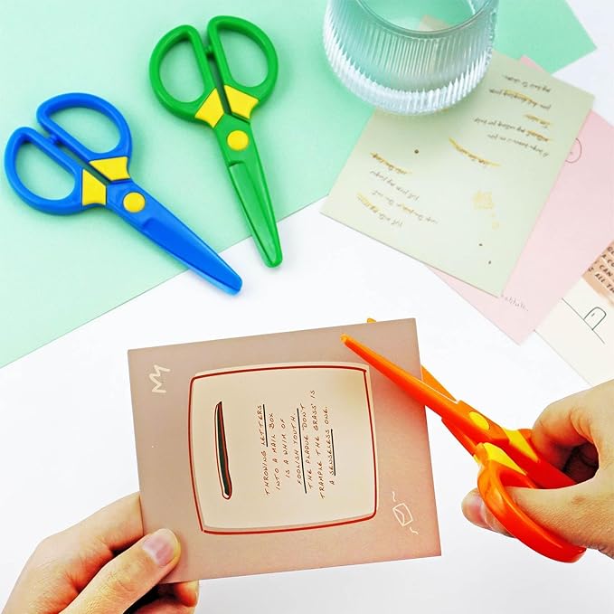 - Made of environmentally friendly plastic, non-toxic. Pre-school scissors offer round tips and plastic blades, which can only cut paper and cards. So you don't have to worry about cutting your children's fingers.