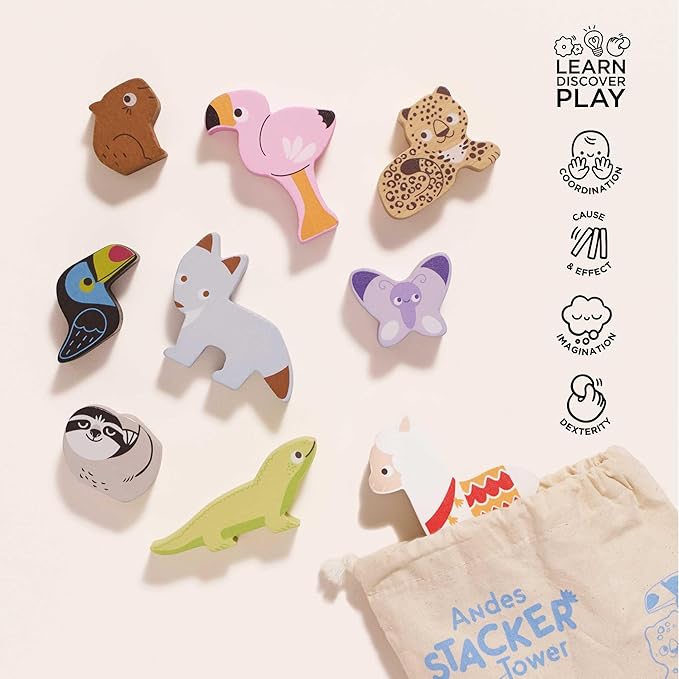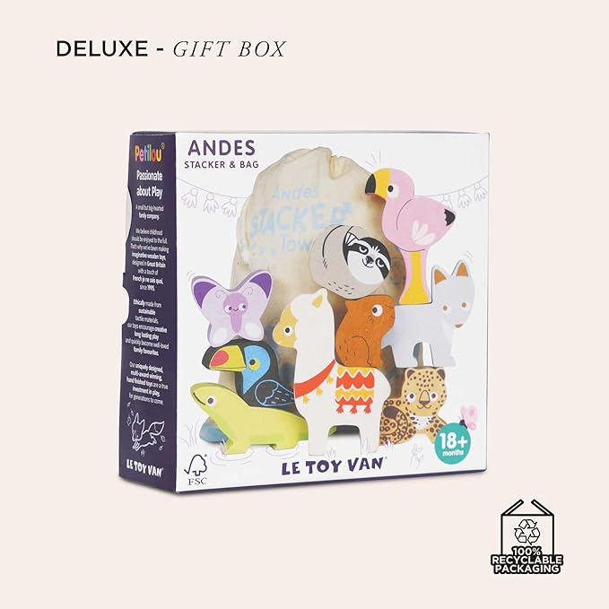 Le Toy Van - Wooden Toys - Andes Stacking & Bag - Petilou Forest Building Blocks Stacker & Bag Educational Balancing Activity Toy - Wooden Blocks Tropical Animal Toys - Kids Toys Age 18 Months +