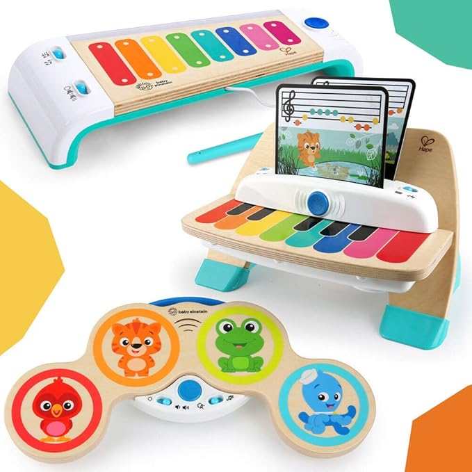 - Wooden toy with Magic Touch technology plays real instrument sounds with just a touch