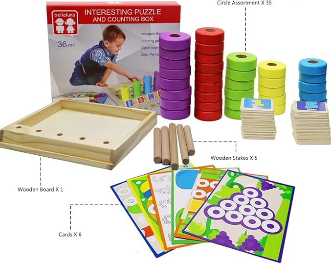 - 👉🏼Learning Number Counting:Stacking the colors circle on the wooden sticks and match the numbers to learn the basic math. Also learning counting by placing different math wooden chips.