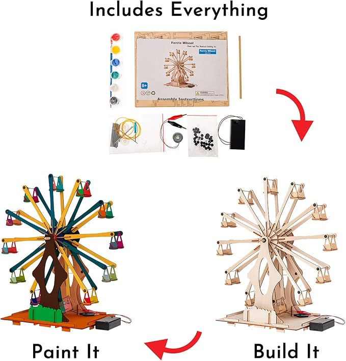 - Includes 6 vibrant, non-toxic paints to customize the ferris wheel model