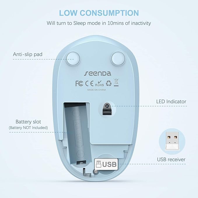 - 2.4GHz STABLE CONNECTION -- 2.4GHz wireless transmission technology provides a powerful and reliable connection up to 33ft, the wireless mouse will turn to sleep mode in 10mins of inactivity, and can be activated by clicking any buttons