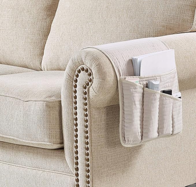 - ORGANIZER WITH UNIQUE DESIGN: Light beige on both sides, with channel quilting, elegant, timeless and unique. Keep your accessories organized and protect your couch armrest against mess. Pets friendly. Made to enhance any decor.