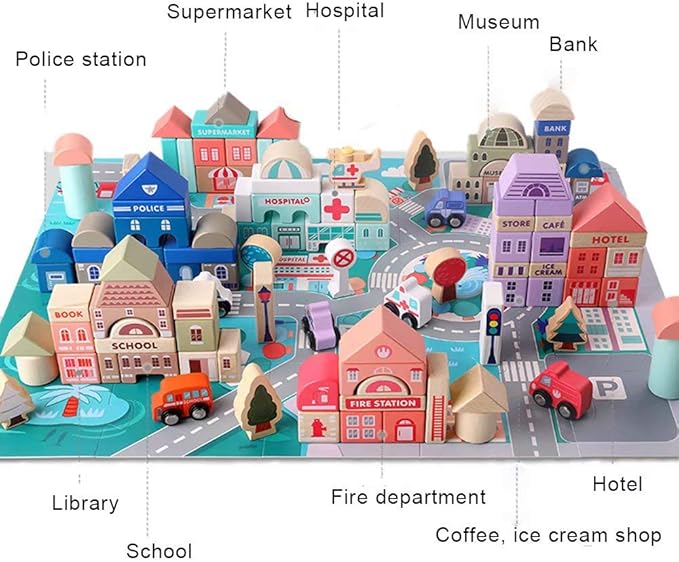 - MOM'S PRIORITY CHOOSE : Why You'll Love It? This smart gift answers to a 3 year old boy and girl’s need to practice independence and will keep them busy while you are dealing with other chores.These wooden building stacking blocks set with play mat , Blocks contains numbers and words. Encourage children know about various of city building and transportation in our life
