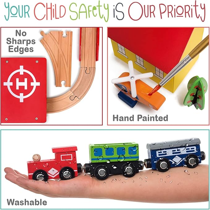 - đ PERFECT SET FOR TRAIN LOVERS â 31 wood train tracks that easily connect, 3 magnetic trains to conduct, a helicopter to fly and 3 cars to drive, an airport playset, a bus station and more. There are even 3 fish and a fishing rod! this wood train set for toddlers has everything a boy or girl needs to be creative.